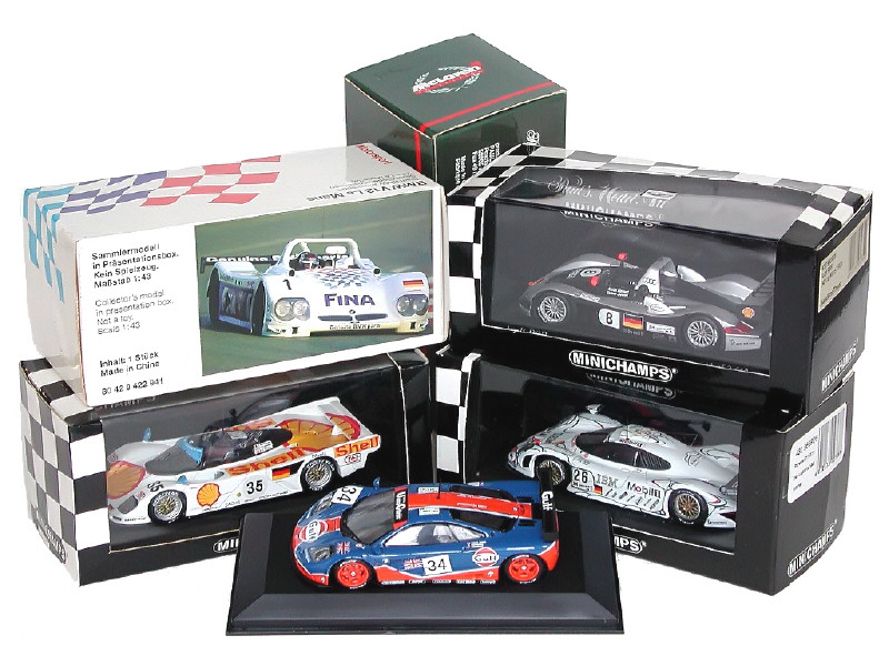 miniatures reproduisant les modèles : PORSCHE 962 GT 1994, Mc LAREN F1 1996, PORSCHE 911 GT1 1998, BMW V12 1998 & AUDI R8R 1999
