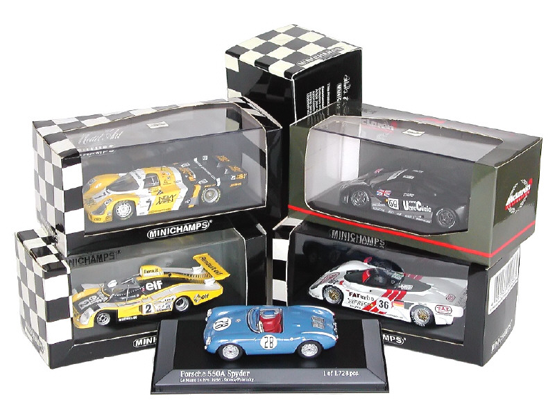 miniatures reproduisant les modèles : PORSCHE 550A 1956, ALPINE RENAULT A442B 1978, PORSCHE 956L 1985, PORSCHE 962 GT 1994 & Mc LAREN F1