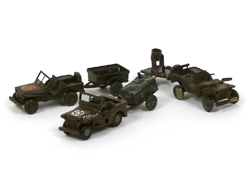 on y joint une JEEP de l'armée américaine de la marque MINIC TOYS - quelques manques & traces d'oxydation - une remorque déformée