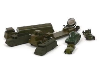 états de 'B' à 'D' - comprend 2 camions-citerne, semi-remorque plateau surbaissé, à ridelles, un char, une JEEP, un canon (état 'E') & un projecteur sur remorque - on y retrouve les marques : TOOTSIETOY & MIDGETOY