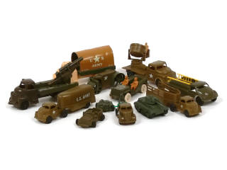 comprend : un camion bâché, porte-projecteur, plateau, dépanneuse, porte-canon, semi-remorque à ridelles, citerne, rouleau compresseur, JEEP (dont une avec remorque) & char d'assaut - on y retrouve notamment les marques : MAJORETTE, BANNER, PYRO & THOMAS TOY - avec manques
