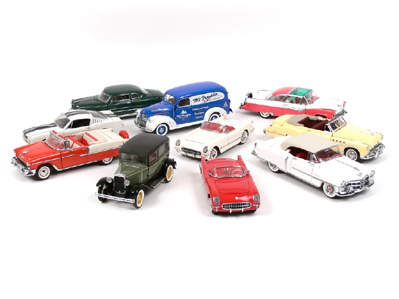 échelle 1/24ème - comprend : CADILLAC ELDORADO cabriolet 1953 (avec accessoire), CHEVROLET CORVETTE ROADSTER 1953, FORD MUSTANG SHELBY GT-350 1965, FORD CROWN VICTORIA 1955, HUDSON HORNET 1951, CHEVROLET CORVETTE 1954, BUICK ROADMASTER 1949, CHEVROLET BEL AIR décapotable 1955 (avec accessoire), FORD MODEL A TUDOR 1930 & CHEVROLET LIGHT DUTY PANEL 'MT FRANKLIN' (avec accessoires) - avec 8 certificats d'authenticité & notices