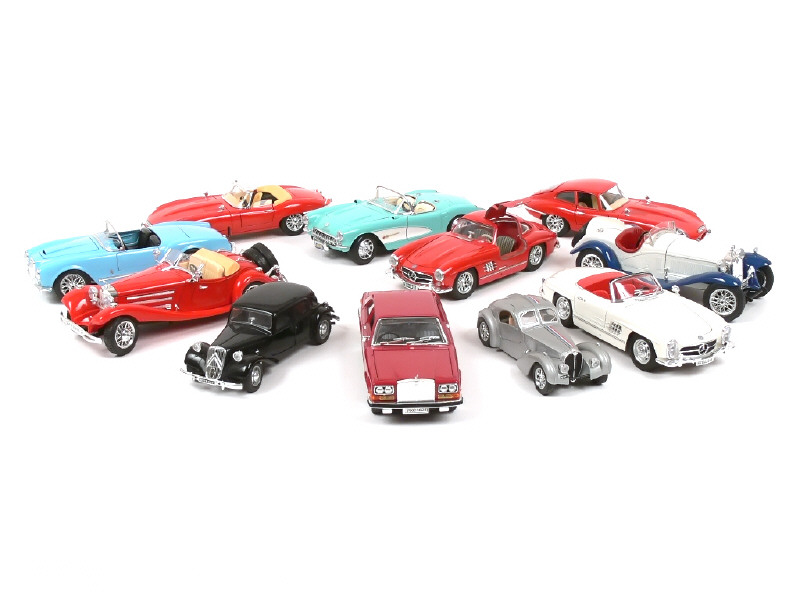 échelles 1/18ème & 1/24ème - miniatures reproduisant les modèles : MERCEDES (5 exemplaires différents) , JAGUAR (4 exemplaires différents), ROLLS ROYCE, CITROEN, LANCIA (pare-brise cassé & incomplet), ALFA ROMEO, BUGATTI & CHEVROLET - avec manques