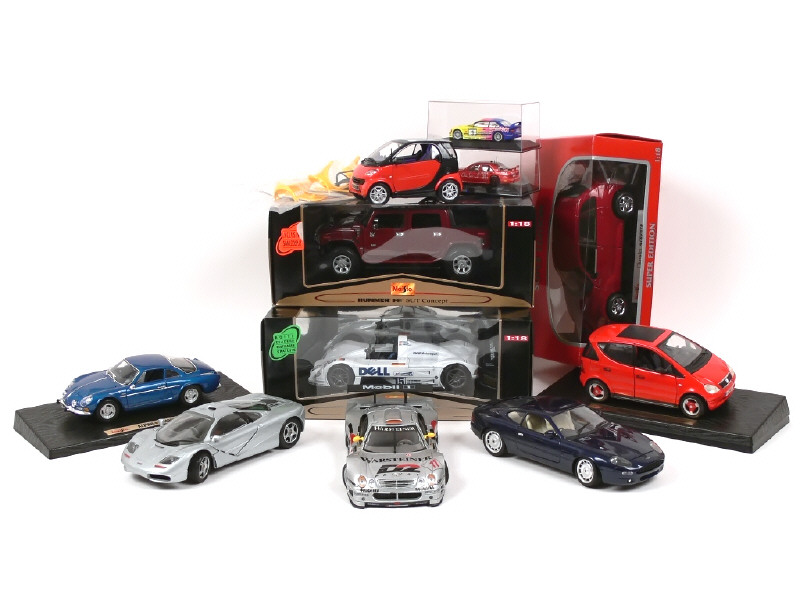 échelles 1/18ème - miniatures reproduisant les modèles : HONDA, MERCEDES (2 exemplaires différents), ALPINE RENAULT, DODGE, CHRYSLER (2 exemplaires différents dont un avec boîte en état 'b'), BMW, HUMMER, Mac LAREN & SMATH (avec sachet d'accessoires) - 5 voitures sur socle de présentation - petits manques - on y joint une ASTON MARTIN de la marque GUILTOY, une MERCEDES & BMW de la marque MINICHAMPS au 1/43ème (avec boîte en état 'a')