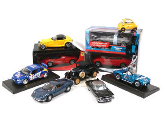 échelle 1/18ème - miniatures reproduisant les modèles : FERRARI (4 exemplaires différents dont 2 avec boîte en état 'a' & un autre avec un élément à refixer), RENAULT (2 exemplaires différents), PLYMOUTH, CATERHAM, ASTON MARTIN (avec boîte en état 'a'), BMW (2 exemplaires différents), CADILLAC (échelle 1/24ème) & FORD (2 exemplaires différents) - 5 voitures sur socle de présentation - petits manques - on y retrouve les marques : HOTWHEELS, JIODI, ANSON, MAJORETTE, REVELL, UT MODELS, FMPM, MOTOR CITY CLASSICS, MINICHAMPS & ERTL