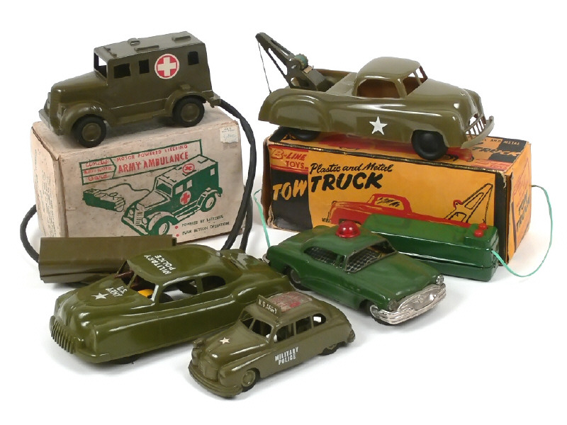 longueur 25 cm - réalisation en plastique - avec inscription au tampon sur la boîte 'N°310 ARMY TOW TRUCK' - on y joint une voiture 'MILITARY POLICE' (carrosserie légèrement déformée & plaques de châssis oxydées) de la MARKS TOY (USA), voiture 'US ARMY (manque un petit élément de toit) de la marque IDEAL (USA) & une voiture américaine de police téléguidée en tôle peinte de la marque LINE MAR TOYS (JAPON)
