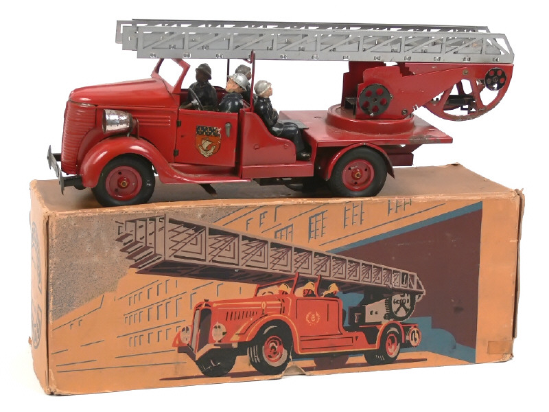 longueur 39 cm - moteur à clef (fonctionne) - avec direction, éclairage électrique (non testé) & 4 pompiers (dont un non d'origine) - manque une ampoule & extrémités de pare-chocs avant - un petit manque sur le couvercle de boîte - quelques traces d'oxydation par endroits principalement sur les phares