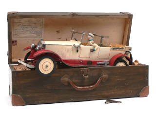 fabrication de 1937/1934 - longueur 52 cm - avec moteur à clef (fonctionne), clef, conducteur, phares électriques (non testé) & direction par le volant (à revoir) - châssis & quelques parties de carrosserie repeints - certains éléments cassés & d'autres ternis - retouches - ce modèle est certainement avec l'HISPANO SUIZA la plus belle fabrication de la firme de Montreuil dans le domaine des automobiles en tôle - avec sa rare boîte-valise de transport en bois (étiquette 'AU BON MARCHE LE CAIRE' numéro 1882 & timbre 'JOUETS FRANCAIS' collés à l'intérieur du couvercle - SUPERBE !