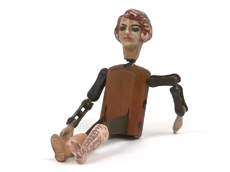 réalisation en composition, métal & bois - hauteur 15 cm - quelques manques de peinture plus ou moins importants par endroits - tête recollée - manque vêtements - une bottine non d'origine