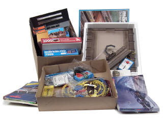 comprend notamment : des éléments de pont, rails, maquette à monter, catalogues, câblages électriques & un pont transporteur - on y retrouve les marques : WIKING, HERPA, MÄRKLIN, BRAWA & VOLLMER - avec manques & parties cassées
