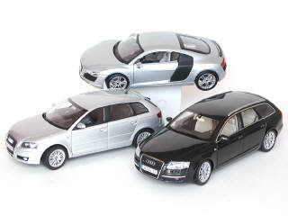 échelle 1/18ème - miniatures reproduisant les modèles : A6 AVANT, R8 & A3 SPORTBACK - on y retrouve les marques : NOREV, MAISTO & KYOSHO