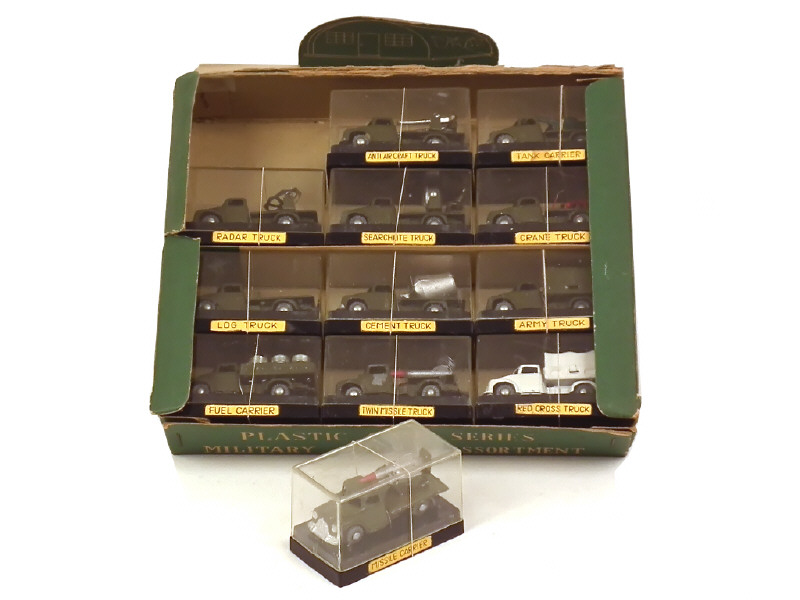 petite échelle - contient : bâché, toupie à ciment (éclat majeur sur le support de toupie), radar, dépannage, CROIX ROUGE, transport de fûts, transport de char, canons-antiaériens, lance missiles (2 versions différentes dont une en état 'E'), projecteur & transport de bois (chargement incomplet) - en boîtes-vitrines individuelles (quelques petites fêlures) - fabrication des années 1950