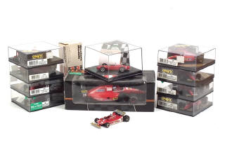 miniatures reproduisant les modèles : F93A (2 exemplaires différents), 412 T1 (2 exemplaires différents), 412 T1B (2 exemplaires différents), 412 T2 (2 exemplaires différents) & F92A (échelle 1/24ème, un axe de roues cassé) - on y joint une FERRARI DINO 156 F1 de la marque QUARTZO avec certificat d'édition limitée numéroté 3162/3500 exemplaires) & 312 T4 de la marque WESTERN MODELS