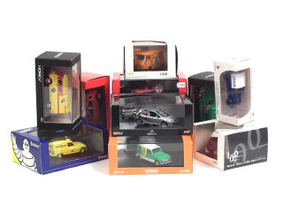 comprend : RENAULT 4L 'RENAULT MOTOCULTURE', 4F4 'MICHELIN', ESTAFETTE 'LION NOIR', 'LAIT MONT-BLANC', PEUGEOT XS 'RADIO FRANCE', PORSCHE CAYENNE V6 pompiers, CITROEN 2CV fourgonnette 'AIR FRANCE', ID 19 break 'PETROLAN' & VOLKSWAGEN DOKA 'BOSCH' - on y joint une RENAULT 4 F4 'PILES WONDER' de la marque VITESSE (boîte en état 'b')