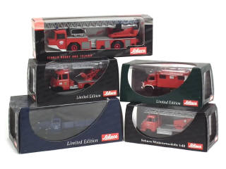 3 séries limitées - comprend : OPEL BLITZ plateau à ridelles avec canot pneumatique, HANOMAG GARANT échelle de pompiers, MERCEDES-BENZ L 319 échelle de pompiers, UNIMOG véhicule radio & MAGIRUS grande échelle de pompiers