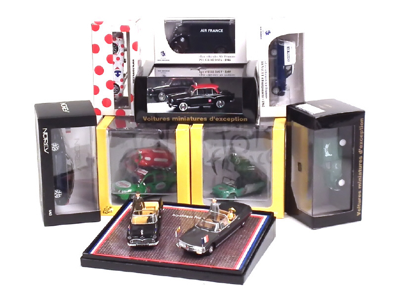 miniatures reproduisant les modèles : CITROEN (4 exemplaires différents), SIMCA (2 exemplaires différents), VOLKSWAGEN (boîte en état 'c'), PEUGEOT, RENAULT & NISSAN - 2 voitures présidentielles en coffret