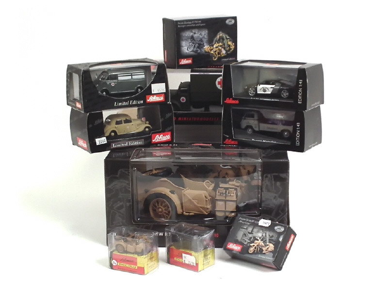 différentes échelles - comprend : AUDI R8, MERCEDES 170 V, L6600 ambulance, DKW fourgon ambulance, TEMPO MATADOR (avec BMW ISETTA) & BMW R75 avec side car - on y joint 4 motos dont 3 avec side-car