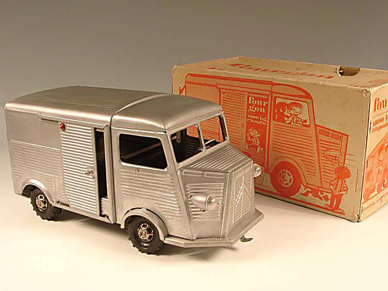 longueur 35 cm - moteur mécanique (fonctionne) - phares électriques - la société CHR de CLICHY avait racheté certains outillages J.R.D. en 1965 pour produire le CITROËN H sous différentes nouvelles versions, avec des roues chromées, munies de pneus crantés - boîte du fourgon téléguidée