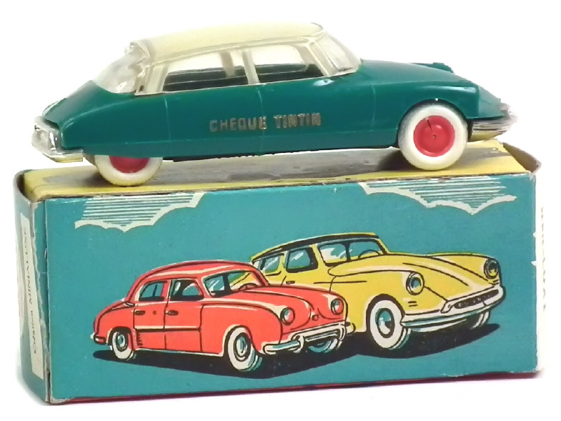 la mention 'CHEQUE TINTIN' est gravée en lettres dorées sur le côté droit de la carrosserie (très légèrement déformée) - ce modèle promotionnel pouvait être obtenu en échange de points que l'on trouvait à l'époque dans le journal de TINTIN - jantes fendues