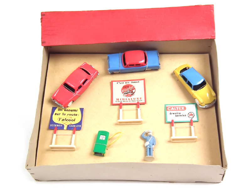 contient : PEUGEOT 403 (carrosserie très légèrement déformée), SIMCA VERSAILLES (partie supérieure de carrosserie non collée), CITROEN DS 19 (carrosserie plus ou moins déformée), 3 panneaux publicitaires, un pompiste & une pompe à essence - sur socle de présentation (légèrement taché) avec élastique de maintien - boîte restaurée avec parties non d'origine