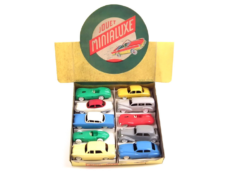 contient : PEUGEOT 403, 203 commerciale, GORDINI de course (manque saute-vent), SIMCA ARIANE, PANHARD PL17, MERCEDES de course, JAGUAR de course (manque saute-vent), CITROEN TRACTION 11 CV & HOTCHKISS GREGOIRE - carrosseries plus ou moins déformées - sur socles de présentation (parties inférieures non d'origine) - boîte tachée par endroits