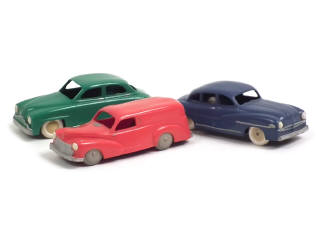 comprend : FORD VEDETTE (état 'B', version avec crochet d'attelage), SIMCA ARONDE (état 'A-', version avec crochet d'attelage) & PEUGEOT 203 fourgonnette (état 'C', carrosserie légèrement déformée, petits détails de peinture argentée ajoutés)