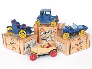 états de 'A' à 'B' - miniatures reproduisant les modèles : AUTOCARRIER 1904, FORD 1907 (petites traces d'oxydation), ALBION 1909 & MORRIS COWLEY 1922 cabriolet - traces de métal fatigue - une retouche - présence de 3 boîtes états 'b'