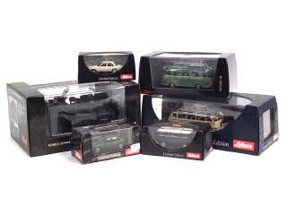 comprend : SETRA S6 autocar (2 exemplaires différents dont un avec une remorque), OPEL ASCONA B, VECTRA, VOLKSWAGEN T2A & ZUNDAPP KS 750 side-car (échelle : 1/10ème) - 5 modèles en séries limitées