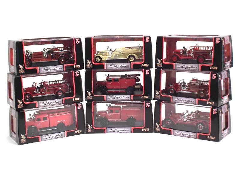série 'SIGNATURE' - miniatures reproduisant les modèles : AHRENS-FOX (2 exemplaires différents), BUFFALO, MACK, MAGIRUS-DEUTZ (2 exemplaires différents), MAXIM, MERCEDES-BENZ & STUTZ