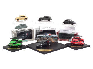 comprend : CITROEN DS 19 présidentielle (série limitée numérotée 108/1968 exemplaires), LAND ROVER, MERCEDES 170, RENAULT 5 (2 exemplaires en série limitée), SAFRANE présidentielle avec figurine de François Mitterrand (série limitée numérotée 1245/7500 exemplaires) & VOLKSWAGEN coccinelle (4 exemplaires différents dont 2 boîtes en état 'd')