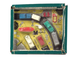 dimensions du coffret : 33 x 30 cm - contient : 3 véhicules, 2 caravanes (une en état 'C'), un cannot à moteur, un élément de carrosserie, un sifflet, un ilot avec pompes à essence & des accessoires en carton - avec rare autographe du fondateur de la marque E.W HERDKLOTZ au verso du coffret