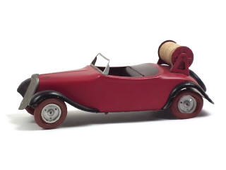 fabriqué par JRD - longueur 28 cm - moteur à clef (fonctionne) - quelques éclats majeurs à l'arrière de la carrosserie & sur le dévidoir - entourage de pare-brise & jantes plus ou moins retouchés - pneus séchés, distendus & craquelés