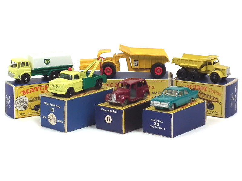 comprend : EUCLID benne carrière, AUSTIN TAXI, DODGE dépanneuse, BEDFORD camion-citerne 'BP', FORD ZEPHYR III & DINKUM DUMPER (série MAJOR PACK)