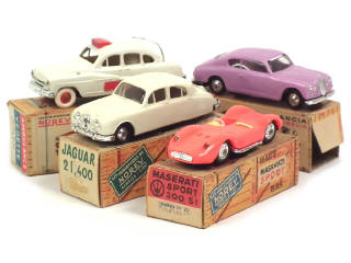 comprend : JAGUAR 2.4 L, MASERATI 200 SI SPORT (quelques manques de pellicule chromée sur la sortie d'échappement), LANCIA AURELIA (boîte en état 'd') & FORD VEDETTE ambulance (élément d'aile & une partie de pare-chocs arrière manquant, jantes légèrement fondues) - petites déformations des carrosseries