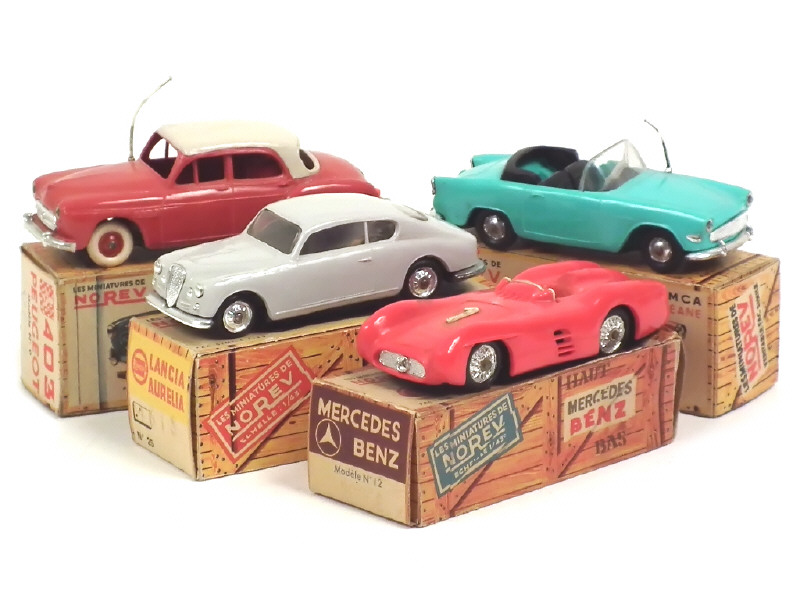 comprend : MERCEDES-BENZ de compétition (état 'C & manque saute-vent), RENAULT FREGATE GRAND PAVOIS ('état 'C' avec boîte non conforme), LANCIA AURELIA & SIMCA OCEANE - petite déformation des carrosseries - légers manques de pellicule chromée - jantes très légèrement fondues