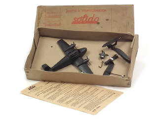 il s'agit du premier coffret d'avion datant de 1943 - comprend : un avion type II bimoteur de couleur noir, un moteur central, un empennage double, un train d'atterrissage d'hydravion & 2 clefs - avec planche de présentation (ficelles de maintien des pièces non d'origine) & notice datée 'été 1943' - coffret taché par endroits