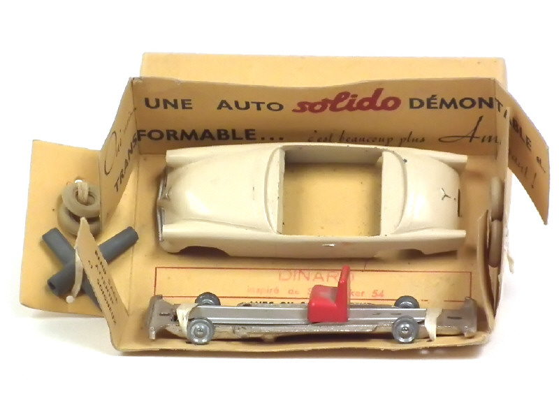 avec une carrosserie de STUDEBAKER 1954 (avec 2 éclats majeurs, manque partie amovible vitrée), châssis (traces de métal fatigue), 4 pneus (séchés) & clef de montage - version sans moteur - boîte légèrement décolorée - avec ficelle & boulons de maintien