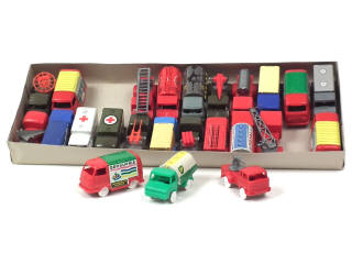 contient 24 véhicules : 4 RENAULT ESTAFETTE (EPICERIE & DROGUERIE), 4 BERNARD (TOTAL, LA VACHE GROSJEAN, PSCHITT & dépannage),14 BERLIET (BP, ambulance, MAGDELEINE, citerne de pompiers, benne à ordures, TRANSEUROPA, 4 véhicules de pompiers, 4 militaires) & MERCEDES (fourgon ambulance militaire & dépanneuse) - quelques traces d'oxydation sur les planchers