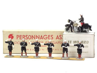 manque une poignée de frein - on y joint un coffret de 6 personnages assortis (POLICE DE LA ROUTE) contenant différents motards (boîte très légèrement tachée)