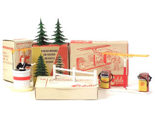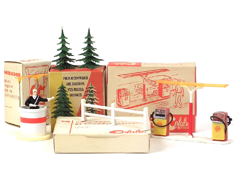 comprend : un mirador avec agent de la circulation, un grand ilot avec 2 pompes à essence (boîte 'c') & 12 barrières pour stations-services & fermes - on y joint 2 sapins (manque supports) en boîte de la marque MINIALUXE