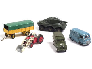 états de 'C' à 'E' - comprend : tracteur agricole MASSEY FERGUSSON, LAND ROVER militaire bâché, engin blindé à 6 roues, RENAULT estafette & remorque à 2 essieux bâchée - on y retrouve les marques : CORGI TOYS, BRITAINS, C.I.J & DINKY TOYS - avec manques & traces d'oxydation