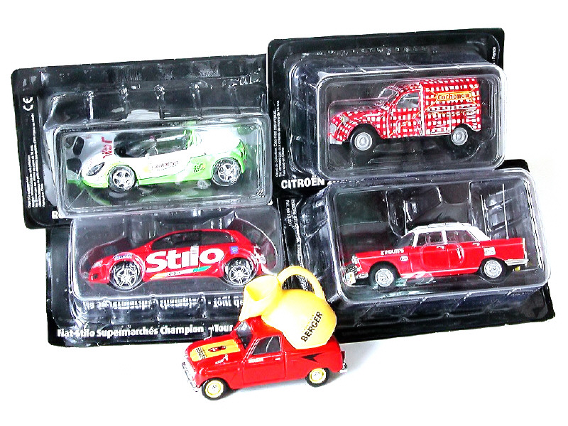 miniatures reproduisant les modèles : CITROEN 2CV, RENAULT 4 (défaut de peinture à l'arrière), PEUGEOT 404, FIAT STILO & RENAULT SPORT spider
