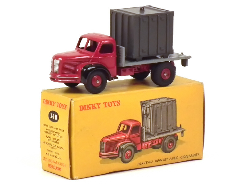 DINKY TOYS (FRANCE) 34B BERLIET Plateau avec container (version avec anneau moulé) rouge, plateau gris clair