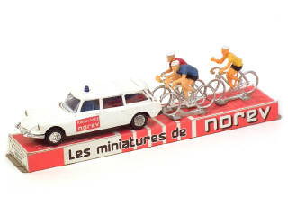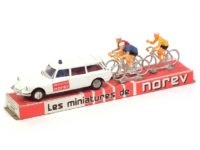 contient : CITROEN ID 19 break 'AMBULANCE NOREV' & 3 coureurs cyclistes - blister déformé & déchiré