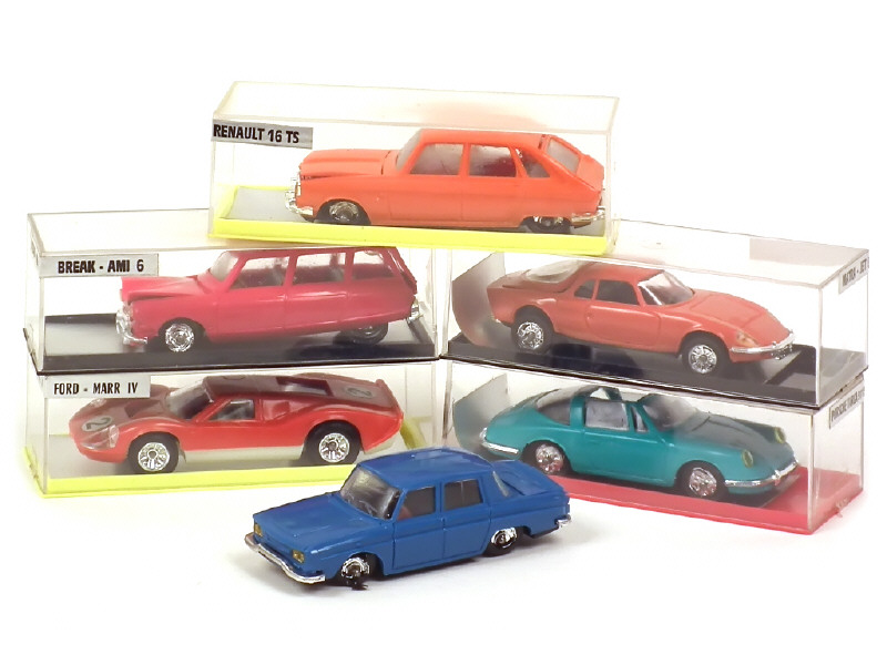 comprend : MATRA SPORT JET 6, CITROEN AMI 6 break (jantes fondues), PORSCHE TARGA 911S (jantes fondues), FORD MARK IV, RENAULT 10 (jantes fondues & vitrage en grande partie opacifié d'origine) & 16 (jantes fondues) - 3 boîtes en état 'c'