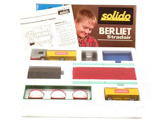 dimensions : 37 x 26 cm - contient : un BERLIET STRADAIR bâché 'LES DEMENAGEURS RAPIDES' avec accessoires pour construire 7 véhicules différents - avec notice (un petit manque) - sous film plastique jamais ouvert - jantes plus ou moins fondues - couvercle de boîte très légèrement déformé - SUPERBE !