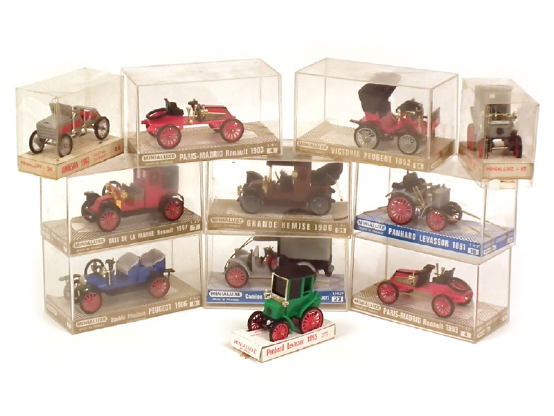 comprend : 2 PANHARD LEVASSOR (1895 (2 exemplaires différents) & 1891), 5 RENAULT (taxi de la Marne 1907, GRANDE REMISE 1906 (3 pneus coupés, boîte en état 'd'), PARIS-MADRID 1903 (2 exemplaires différents), camion de la première guerre mondiale), 2 PEUGEOT (VICTORIA 1892 & DOUBLE PHAETON 1906) & JAMIESON 1902