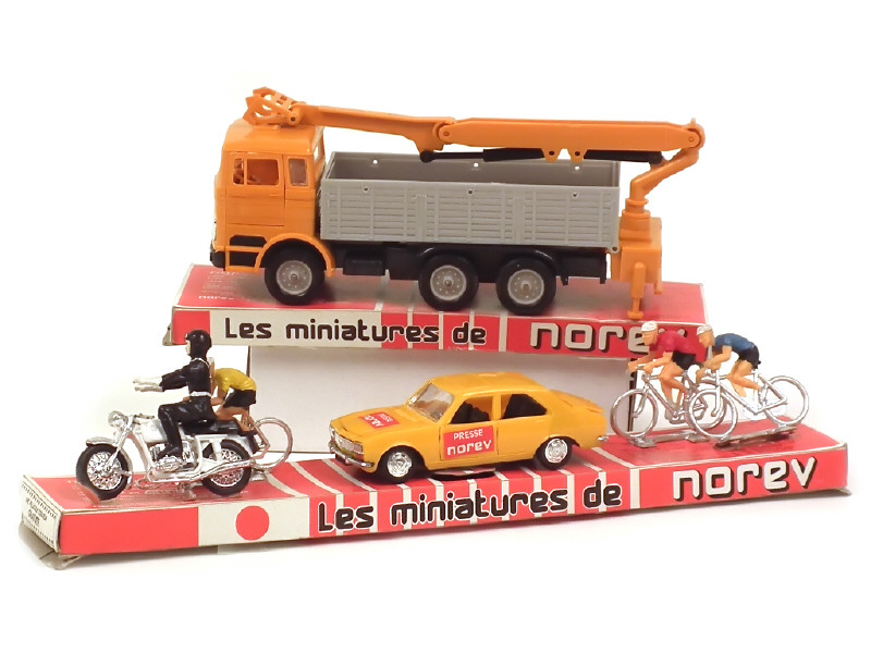 contient : PEUGEOT 504 'PRESSE NOREV', un motard de la police & 3 coureurs cyclistes avec maillots de différentes couleurs - un vélo & la moto décollés du socle