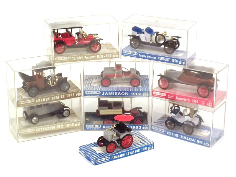 comprend : CITROEN B2 1925, RENAULT GRANDE REMISE 1906, PANHARD LEVASSOR 1891 (2 pneus coupés), PEUGEOT DOUBLE PHAETON 1906, PANHARD LEVASSOR, SKIFF LABOURDETTE 1914 , BALDA VIS A VIS 1895 (manque une antenne), autocar 1903 (socle incomplet, quelques petits éléments cassés), JAMIESON 1902 & PEUGEOT TORPEDO 1906