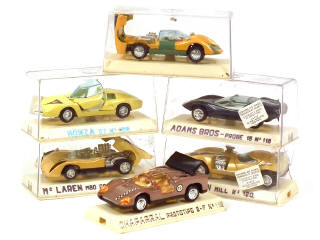 comprend : CHAPARRAL 2-F, PORSCHE CARRERA 6, MONZA GT, ADAMS BROS, Mc LAREN M80 (boîte état 'c') & T WIN MILL (boîte en état 'd') - quelques jantes très légèrement fondues